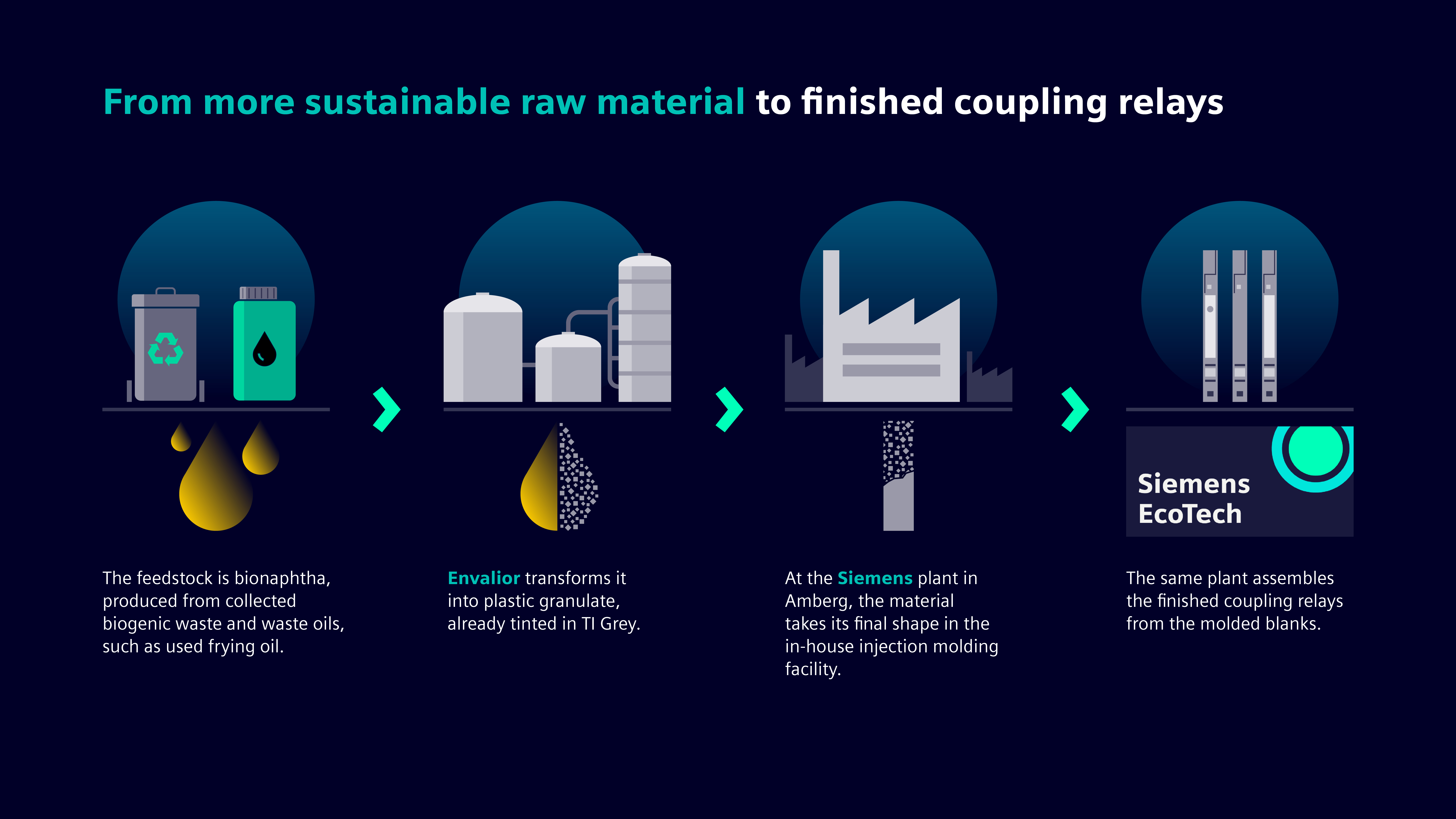 Siemens Smart Infrastructure has collaborated with Envalior on a sustainable series of coupling relays with housing made from Envalior’s Akulon K225-KS B-MB plastic, which consists of 70% material derived from biomass waste.